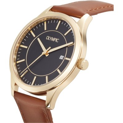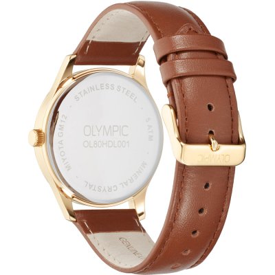 Diese Olympic Uhr hat ein Edelstahl Gehäuse mit einem Durchmesser von 40 mm und ist mit einem Armband aus Leder versehen. In der Uhr arbeitet ein Miyota Uhrwerk. Das Glas der Uhr besteht aus Mineral - Glas.