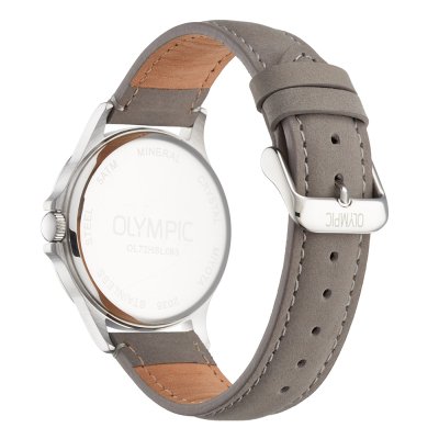 Diese Olympic Uhr hat ein Edelstahl Gehäuse mit einem Durchmesser von 40 mm und ist mit einem Armband aus Leder versehen. In der Uhr arbeitet ein Miyota Uhrwerk. Das Glas der Uhr besteht aus Mineral - Glas.