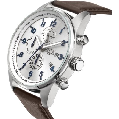 Diese Olympic Uhr hat ein Edelstahl Gehäuse mit einem Durchmesser von 40 mm und ist mit einem Armband aus Leder versehen. In der Uhr arbeitet ein Seiko Instruments Inc. Uhrwerk. Das Glas der Uhr besteht aus Mineral - Glas.