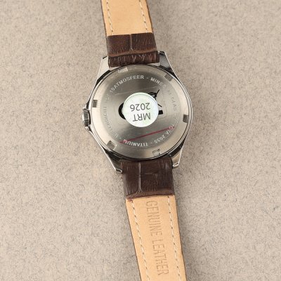 Diese Olympic Uhr hat ein Titan Gehäuse mit einem Durchmesser von 29 mm und ist mit einem Armband aus Leder versehen. In der Uhr arbeitet ein Miyota Uhrwerk. Das Glas der Uhr besteht aus Mineral - Glas.