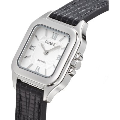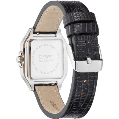 Diese Olympic Uhr hat ein Edelstahl Gehäuse mit einem Durchmesser von 26 mm und ist mit einem Armband aus Leder versehen. In der Uhr arbeitet ein Miyota Uhrwerk. Das Glas der Uhr besteht aus Sapphir - Glas.