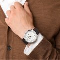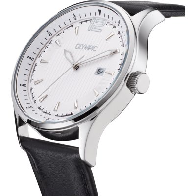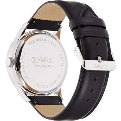 Diese Olympic Uhr hat ein Edelstahl Gehäuse mit einem Durchmesser von 43 mm und ist mit einem Armband aus Leder versehen. In der Uhr arbeitet ein Miyota Uhrwerk. Das Glas der Uhr besteht aus Mineral - Glas.