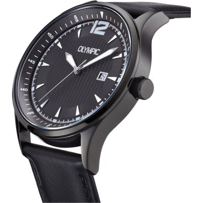 Diese Olympic Uhr hat ein Edelstahl Gehäuse mit einem Durchmesser von 43 mm und ist mit einem Armband aus Leder versehen. In der Uhr arbeitet ein Miyota Uhrwerk. Das Glas der Uhr besteht aus Mineral - Glas.