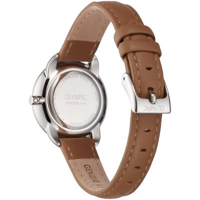 Diese Olympic Uhr hat ein Edelstahl Gehäuse mit einem Durchmesser von 31 mm und ist mit einem Armband aus Leder versehen. In der Uhr arbeitet ein Miyota Uhrwerk. Das Glas der Uhr besteht aus Mineral - Glas.