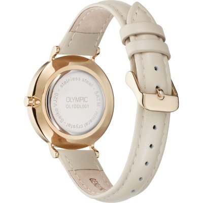 Diese Olympic Uhr hat ein Edelstahl Gehäuse mit einem Durchmesser von 32 mm und ist mit einem Armband aus Leder versehen. In der Uhr arbeitet ein Seiko Instruments Inc. Uhrwerk. Das Glas der Uhr besteht aus Mineral - Glas.