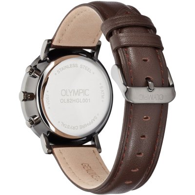 Diese Olympic Uhr hat ein Edelstahl Gehäuse mit einem Durchmesser von 40 mm und ist mit einem Armband aus Leder versehen. In der Uhr arbeitet ein Seiko Instruments Inc. Uhrwerk. Das Glas der Uhr besteht aus Sapphir - Glas.