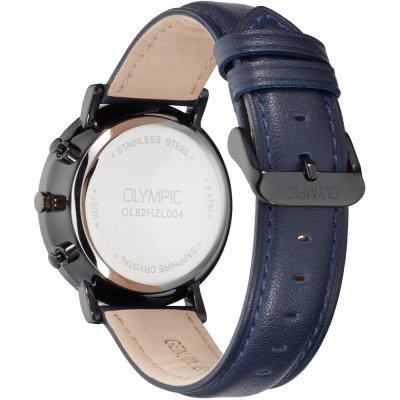 Diese Olympic Uhr hat ein Edelstahl Gehäuse mit einem Durchmesser von 40 mm und ist mit einem Armband aus Leder versehen. In der Uhr arbeitet ein Seiko Instruments Inc. Uhrwerk. Das Glas der Uhr besteht aus Sapphir - Glas.
