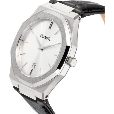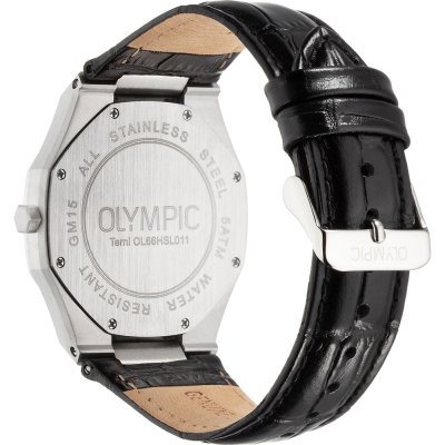 Diese Olympic Uhr hat ein Edelstahl Gehäuse mit einem Durchmesser von 40 mm und ist mit einem Armband aus Leder versehen. In der Uhr arbeitet ein Miyota Uhrwerk. Das Glas der Uhr besteht aus Mineral - Glas.