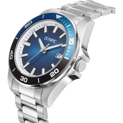 Diese Olympic Uhr hat ein Edelstahl Gehäuse mit einem Durchmesser von 40 mm und ist mit einem Armband aus Edelstahl versehen. In der Uhr arbeitet ein Seiko Instruments Inc. Uhrwerk. Das Glas der Uhr besteht aus Mineral - Glas.