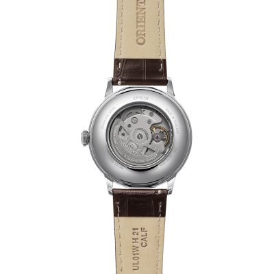 Diese Orient Uhr hat ein Edelstahl Gehäuse mit einem Durchmesser von 40 mm und ist mit einem Armband aus Leder versehen. In der Uhr arbeitet ein Orient Uhrwerk. Das Glas der Uhr besteht aus Mineral - Glas.