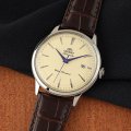 Diese Orient Uhr hat ein Edelstahl Gehäuse mit einem Durchmesser von 40 mm und ist mit einem Armband aus Leder versehen. In der Uhr arbeitet ein Orient Uhrwerk. Das Glas der Uhr besteht aus Mineral - Glas.