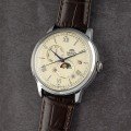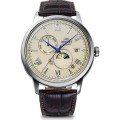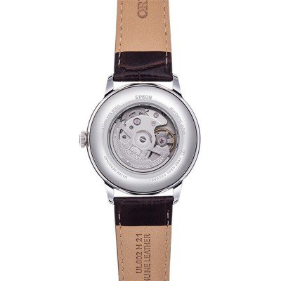 Diese Orient Uhr hat ein Edelstahl Gehäuse mit einem Durchmesser von 41.5 mm und ist mit einem Armband aus Leder versehen. In der Uhr arbeitet ein Epson Uhrwerk. Das Glas der Uhr besteht aus Mineral - Glas.