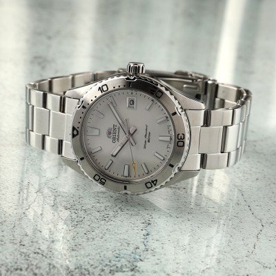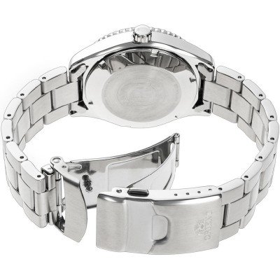 Diese Orient Uhr hat ein Edelstahl Gehäuse mit einem Durchmesser von 40 mm und ist mit einem Armband aus Metall versehen. In der Uhr arbeitet ein Orient Uhrwerk. Das Glas der Uhr besteht aus Sapphir - Glas.