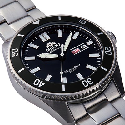 Diese Orient Uhr hat ein Edelstahl Gehäuse mit einem Durchmesser von 44 mm und ist mit einem Armband aus Metall versehen. In der Uhr arbeitet ein Orient Uhrwerk. Das Glas der Uhr besteht aus Mineral - Glas.