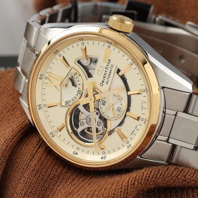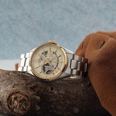Die Orient Star Modern Skeleton Automatic ist Teil der Kollektion Contemporary. Seit ihrer Einführung im Jahr 2014 ist sie weltweit ein Bestseller. Die neuesten Mitglieder der Familie zeichnen sich durch Zifferblattfarben aus, die die metallischen Texturen des Gehäuses und anderer Uhrenteile ergänzen, die durch geschickt platzierte Öffnungen im Zifferblatt sichtbar sind. Neben den Fenstern in das Innenleben der Uhr befinden sich eine Gangreserveanzeige bei 12 Uhr und eine kleine Sekunde bei 6 Uhr. Angetrieben wird die Uhr von einem mechanischen Hauskaliber F6F44, das eine stabile Ganggenauigkeit von +25 Sekunden bis -15 Sekunden pro Tag und eine Gangreserve von 50 Stunden bietet. Die visuelle Harmonie zwischen dem Zifferblatt und dem darunter liegenden mechanischen Uhrwerk schafft ein Zifferblatt, das sowohl praktisch als auch faszinierend ist; perfekt für den Mann, der die Liebe zum Detail und zur Technologie schätzt.