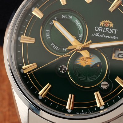 Diese Orient Uhr hat ein Edelstahl Gehäuse mit einem Durchmesser von 41 mm und ist mit einem Armband aus Edelstahl versehen. In der Uhr arbeitet ein Epson Uhrwerk. Das Glas der Uhr besteht aus Sapphir - Glas.