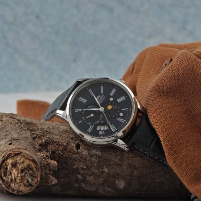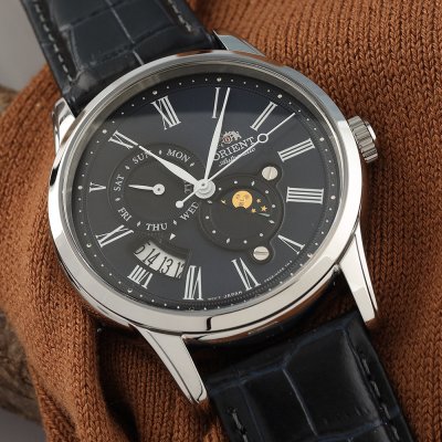 Diese Orient Uhr hat ein Edelstahl Gehäuse mit einem Durchmesser von 42 mm und ist mit einem Armband aus Leder versehen. In der Uhr arbeitet ein Epson Uhrwerk. Das Glas der Uhr besteht aus Sapphir - Glas.