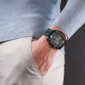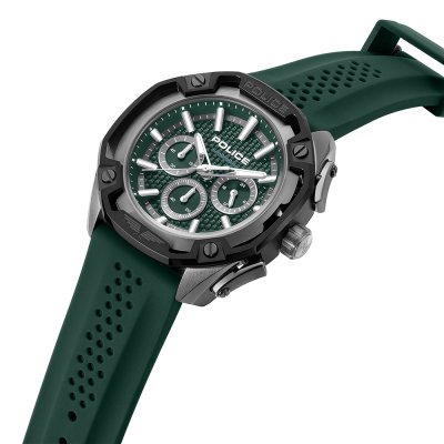 Diese Police Uhr hat ein Edelstahl Gehäuse mit einem Durchmesser von 46 mm und ist mit einem Armband aus Kautschuk versehen. In der Uhr arbeitet ein Seiko Instruments Inc. Uhrwerk. Das Glas der Uhr besteht aus Mineral - Glas.