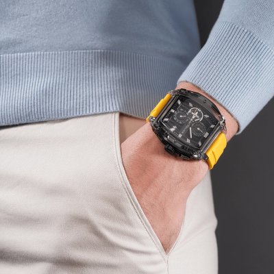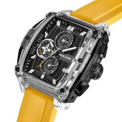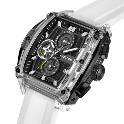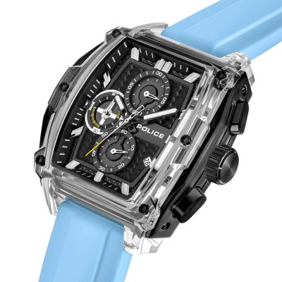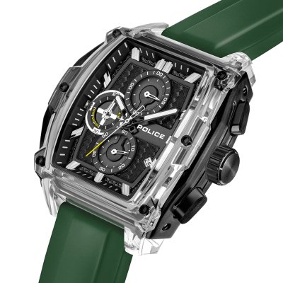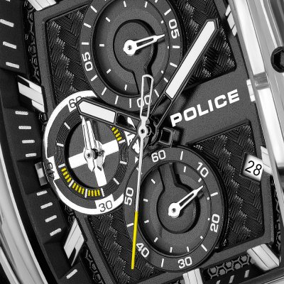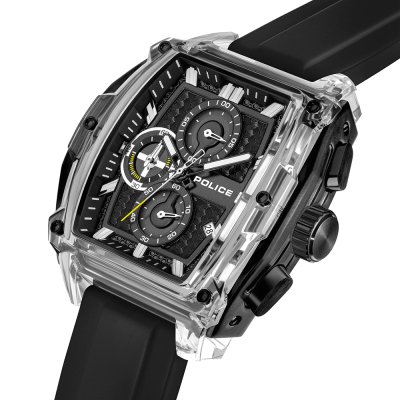 Diese Police Uhr hat ein Kunstharz Gehäuse mit einem Durchmesser von 46 mm und ist mit einem Armband aus Kautschuk versehen. In der Uhr arbeitet ein Seiko Instruments Inc. Uhrwerk. Das Glas der Uhr besteht aus Mineral - Glas.