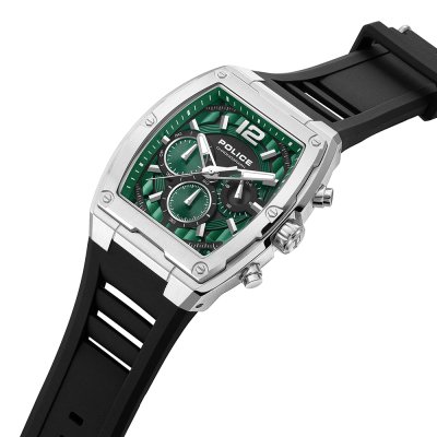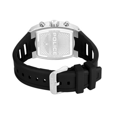 Diese Police Uhr hat ein Edelstahl Gehäuse mit einem Durchmesser von 42 mm und ist mit einem Armband aus Kautschuk versehen. In der Uhr arbeitet ein Seiko Instruments Inc. Uhrwerk. Das Glas der Uhr besteht aus Mineral - Glas.