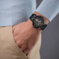 Diese Police Uhr hat ein Kunstharz Gehäuse mit einem Durchmesser von 44 mm und ist mit einem Armband aus Kautschuk versehen. In der Uhr arbeitet ein CN Uhrwerk. Das Glas der Uhr besteht aus Mineral - Glas.