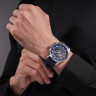 Diese Police Uhr hat ein Edelstahl Gehäuse mit einem Durchmesser von 45 mm und ist mit einem Armband aus Kautschuk versehen. In der Uhr arbeitet ein Seiko Instruments Inc. Uhrwerk. Das Glas der Uhr besteht aus Mineral - Glas.