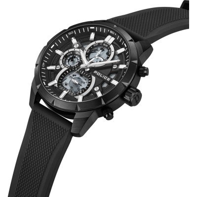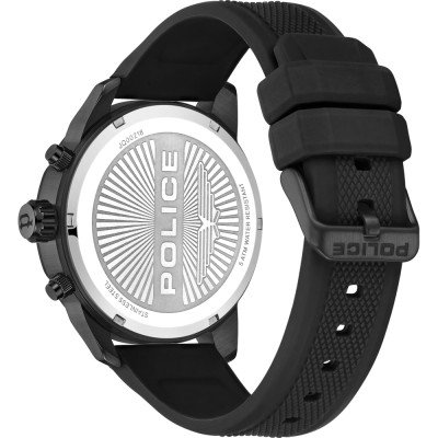 Diese Police Uhr hat ein Edelstahl Gehäuse mit einem Durchmesser von 45 mm und ist mit einem Armband aus Kautschuk versehen. In der Uhr arbeitet ein Seiko Instruments Inc. Uhrwerk. Das Glas der Uhr besteht aus Mineral - Glas.