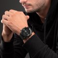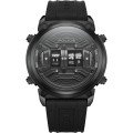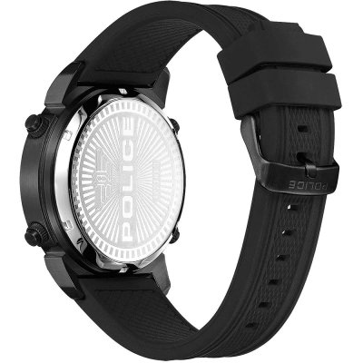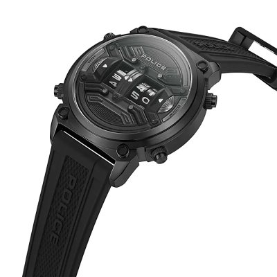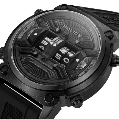 Diese Police Uhr hat ein Edelstahl Gehäuse mit einem Durchmesser von 50 mm und ist mit einem Armband aus Kautschuk versehen. In der Uhr arbeitet ein CN Uhrwerk. Das Glas der Uhr besteht aus Mineral - Glas.