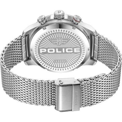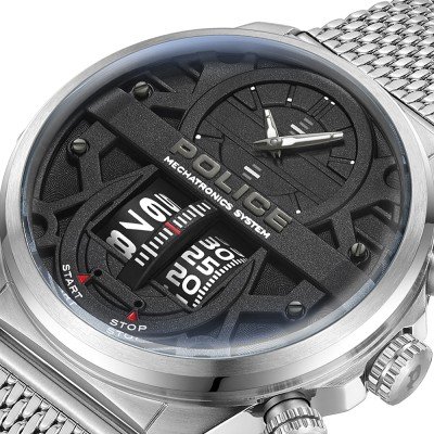 Diese Police Uhr hat ein Edelstahl Gehäuse mit einem Durchmesser von 44 mm und ist mit einem Armband aus Edelstahl versehen. In der Uhr arbeitet ein Bao Jie Uhrwerk. Das Glas der Uhr besteht aus Mineral - Glas.