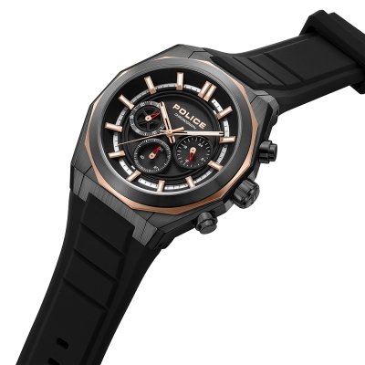 Diese Police Uhr hat ein Edelstahl Gehäuse mit einem Durchmesser von 46 mm und ist mit einem Armband aus Kautschuk versehen. In der Uhr arbeitet ein Seiko Instruments Inc. Uhrwerk. Das Glas der Uhr besteht aus Mineral - Glas.