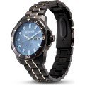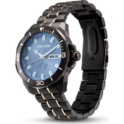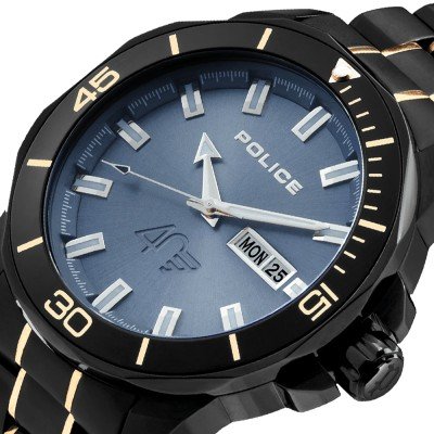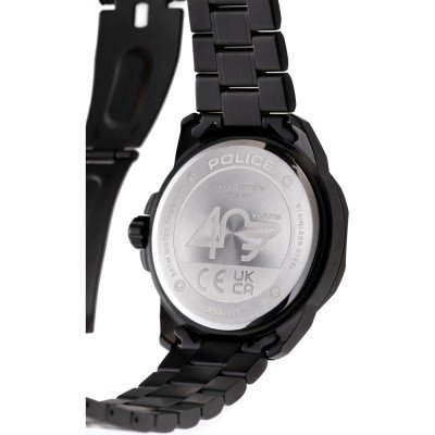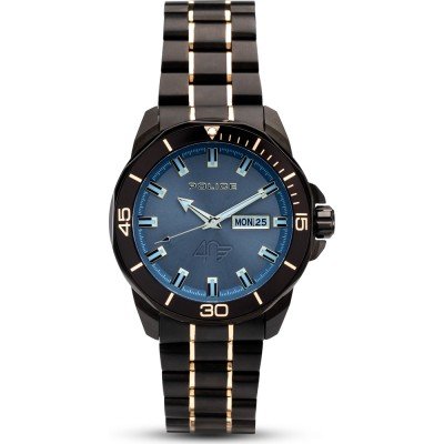 Diese Police Uhr hat ein Edelstahl Gehäuse mit einem Durchmesser von 43 mm und ist mit einem Armband aus Metall versehen. In der Uhr arbeitet ein Miyota Uhrwerk. Das Glas der Uhr besteht aus Mineral - Glas.