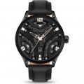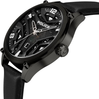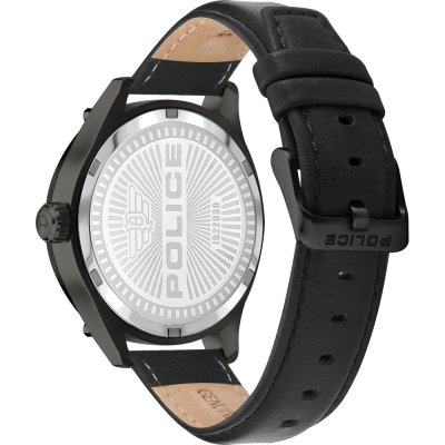 Diese Police Uhr hat ein Edelstahl Gehäuse mit einem Durchmesser von 46 mm und ist mit einem Armband aus Leder versehen. In der Uhr arbeitet ein Seiko Instruments Inc. Uhrwerk. Das Glas der Uhr besteht aus Mineral - Glas.