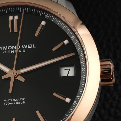 Diese jüngste Ergänzung der Raymond Weil Freelancer Linie verbindet klassische Eleganz mit moderner Raffinesse. Die Uhr verfügt über ein hauseigenes mechanisches Uhrwerk mit Automatikaufzug und einer Gangreserve von 41 Stunden (RW4420). Die Bandanstöße des 40-mm-Gehäuses sind gewölbt, so dass die Uhr bequem am Handgelenk sitzt, ebenso wie das Jubiläumsarmband mit Doppeldruck-Faltschließe. Die engeren Linien der Lünette und die Hochglanzpolitur sowie das Sonnenschliff-Zifferblatt verstärken die Tiefe und das dynamische Lichtspiel. Applizierte Indexe und raffinierte Zeiger mit weißer Super-LumiNova sorgen für optimale Ablesbarkeit, während eine dezente Minuterie auf der inneren Lünette das harmonische Design vervollständigt. Die verschraubte Krone ist mit einem RW-Monogramm geprägt, und durch den Saphirglasboden ist das Automatikwerk mit der W-förmigen Schwungmasse zu sehen - ein unverkennbares Markenzeichen von Raymond Weil.