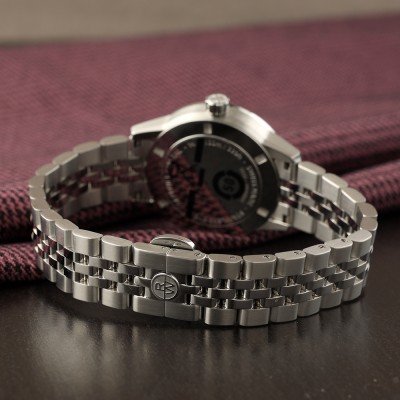 Diese Raymond Weil Uhr hat ein Edelstahl Gehäuse mit einem Durchmesser von 34 mm und ist mit einem Armband aus Edelstahl versehen. In der Uhr arbeitet ein ETA Uhrwerk. Das Glas der Uhr besteht aus Sapphir - Glas.