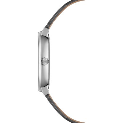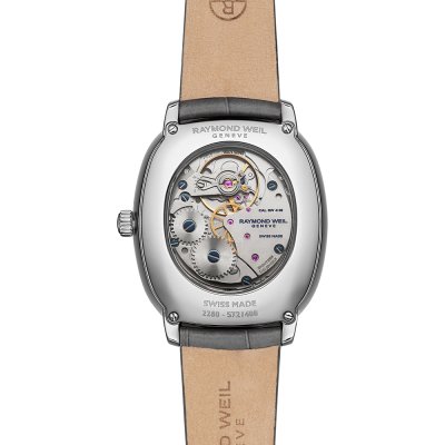 Diese Raymond Weil Uhr hat ein Edelstahl Gehäuse mit einem Durchmesser von 33 mm und ist mit einem Armband aus Leder versehen. In der Uhr arbeitet ein Raymond Weil Uhrwerk. Das Glas der Uhr besteht aus Sapphir - Glas.