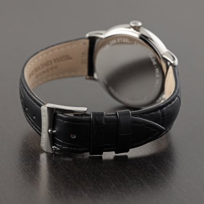 Diese Raymond Weil Uhr hat ein Edelstahl Gehäuse mit einem Durchmesser von 39 mm und ist mit einem Armband aus Leder versehen. In der Uhr arbeitet ein ETA Uhrwerk. Das Glas der Uhr besteht aus Sapphir - Glas.