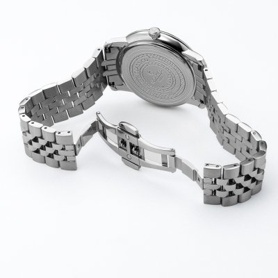 Diese Roamer Uhr hat ein Edelstahl Gehäuse mit einem Durchmesser von 40 mm und ist mit einem Armband aus Edelstahl versehen. In der Uhr arbeitet ein Ronda Uhrwerk. Das Glas der Uhr besteht aus Sapphir - Glas.