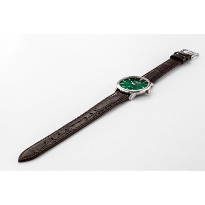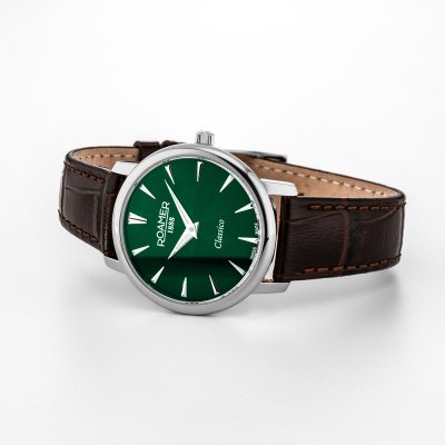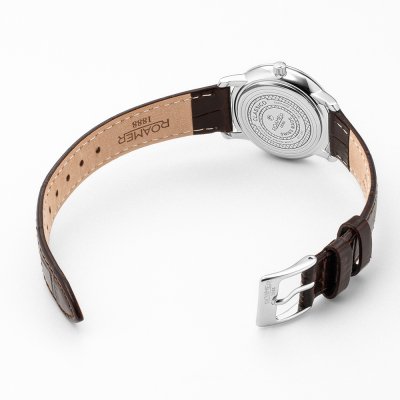 Diese Roamer Uhr hat ein Edelstahl Gehäuse mit einem Durchmesser von 30 mm und ist mit einem Armband aus Leder versehen. In der Uhr arbeitet ein Ronda Uhrwerk. Das Glas der Uhr besteht aus Sapphir - Glas.