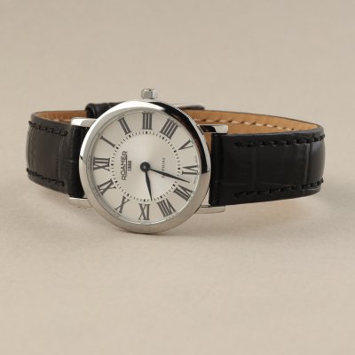 Diese Roamer Uhr hat ein Edelstahl Gehäuse mit einem Durchmesser von 28 mm und ist mit einem Armband aus Leder versehen. In der Uhr arbeitet ein Ronda Uhrwerk. Das Glas der Uhr besteht aus Sapphir - Glas.