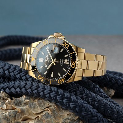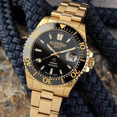 Die Uhr ist wasserdicht bis 20 ATM. Dies bedeutet, dass die Uhr zum Tauchen geeignet ist.. Die Uhr wird mit Roamer 2+5 geliefert.