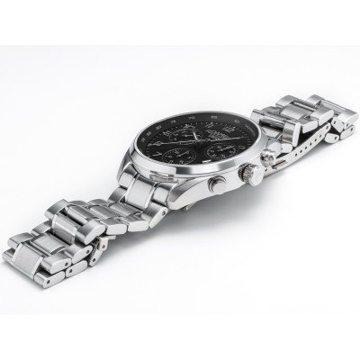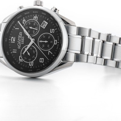 Diese Roamer Uhr hat ein Edelstahl Gehäuse mit einem Durchmesser von 42 mm und ist mit einem Armband aus Edelstahl versehen. In der Uhr arbeitet ein Ronda Uhrwerk. Das Glas der Uhr besteht aus Sapphir - Glas.