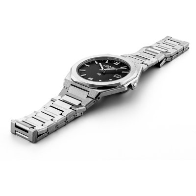 Diese Roamer Uhr hat ein Edelstahl Gehäuse mit einem Durchmesser von 41 mm und ist mit einem Armband aus Edelstahl versehen. In der Uhr arbeitet ein Ronda Uhrwerk. Das Glas der Uhr besteht aus Sapphir - Glas.