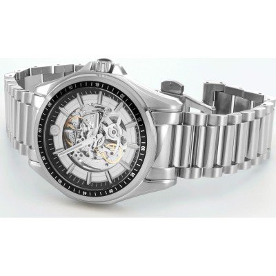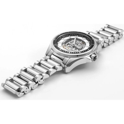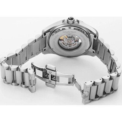 Diese Roamer Uhr hat ein Edelstahl Gehäuse mit einem Durchmesser von 44 mm und ist mit einem Armband aus Edelstahl versehen. In der Uhr arbeitet ein Soprod Uhrwerk. Das Glas der Uhr besteht aus Sapphir - Glas.