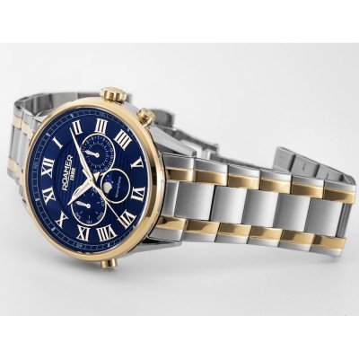 Diese Roamer Uhr hat ein Edelstahl Gehäuse mit einem Durchmesser von 43 mm und ist mit einem Armband aus Metall versehen. In der Uhr arbeitet ein Ronda Uhrwerk. Das Glas der Uhr besteht aus Sapphir - Glas.