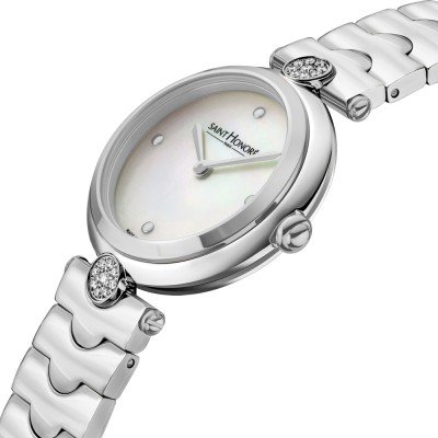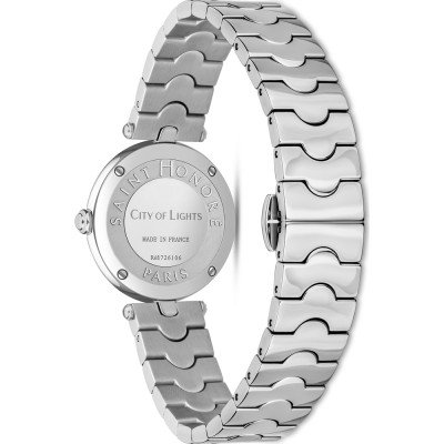 Diese Saint Honoré Uhr hat ein Edelstahl Gehäuse mit einem Durchmesser von 30 mm und ist mit einem Armband aus Edelstahl versehen. In der Uhr arbeitet ein Ronda Uhrwerk. Das Glas der Uhr besteht aus Mineral - Glas.