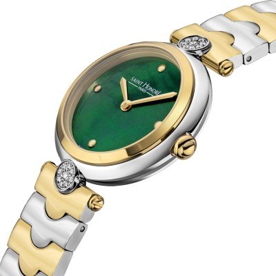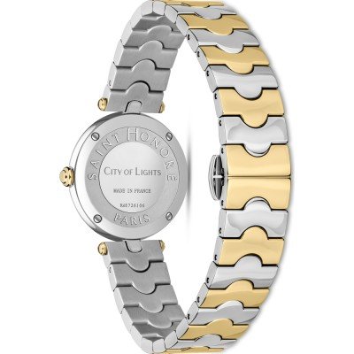 Diese Saint Honoré Uhr hat ein Edelstahl Gehäuse mit einem Durchmesser von 28 mm und ist mit einem Armband aus Edelstahl versehen. In der Uhr arbeitet ein Ronda Uhrwerk. Das Glas der Uhr besteht aus Mineral - Glas.