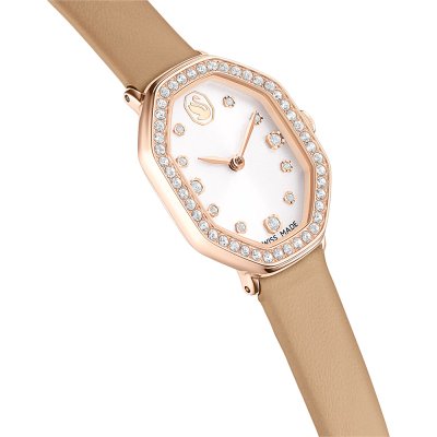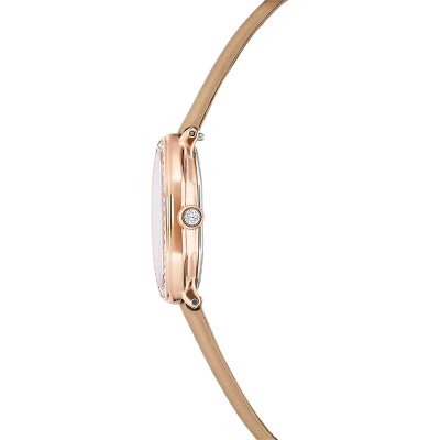 Diese Swarovski Uhr hat ein Edelstahl Gehäuse mit einem Durchmesser von 18 mm und ist mit einem Armband aus Leder versehen. In der Uhr arbeitet ein Ronda Uhrwerk. Das Glas der Uhr besteht aus Mineral - Glas.