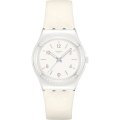 Diese Swatch Uhr hat ein Edelstahl Gehäuse mit einem Durchmesser von 33 mm und ist mit einem Armband aus Leder versehen. In der Uhr arbeitet ein ETA Uhrwerk. Das Glas der Uhr besteht aus Acryl - Glas.