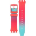 Dieses Swatch Uhrarmband ist aus silikon gefertigt und wird mit stahlstifte an der Uhr befestigt. Das Band hat eine Breite von 20.1 mm und wird mit einer dornschließe geschlossen. Das Uhrenarmband hat keine gerade Halterung, was bedeutet, dass dieses Band nur für die unten aufgeführten Uhren geeignet ist.