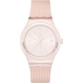 Dieses Swatch Uhrarmband ist aus silikon gefertigt und wird mit stahlstifte an der Uhr befestigt. Das Band hat eine Breite von 19.6 mm und wird mit einer dornschließe geschlossen. Das Uhrenarmband hat keine gerade Halterung, was bedeutet, dass dieses Band nur für die unten aufgeführten Uhren geeignet ist.